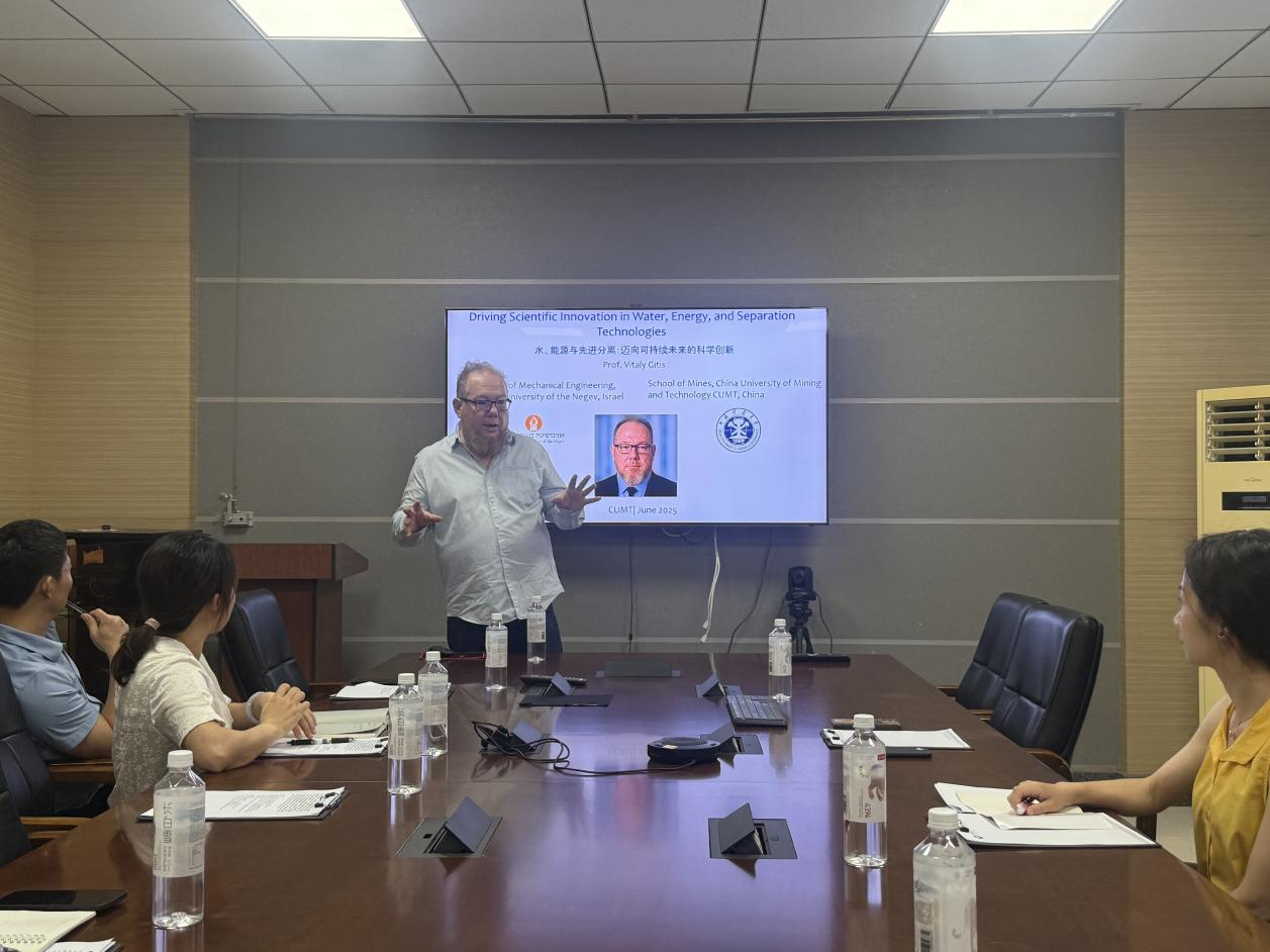 Vitaly Gitis教授作报告2025年6月10日上午,中国矿业大学炼焦煤资源绿色开发全国重点实验室(以下简称“炼焦煤全重”)邀请本古里安大学Vitaly Gitis教授来华交流,为师生带来题为“Driving Scientific Innovation in Water,Energy,and Separation Technologies”的学术讲座。Vitaly Gitis教授重点聚焦纳米结构陶瓷膜技术,深入阐述了其在金属离子选择性回收领域的前沿进展与应用前景。讲解内容深入浅出,引发了与会师生的浓厚兴趣。讲座现场互动交流热烈,有效拓宽了师生在相关领域的国际视野拓展与前沿认知。新闻来源:高明强新闻摄影:高瑞泽一审一校:朱红菊二审二校:苗真勇三审三校:桂夏辉