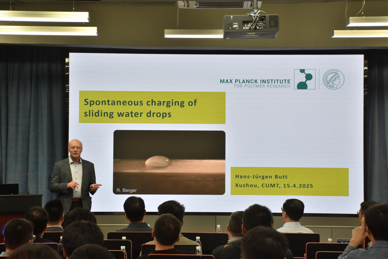 2025 年 4 月15日下午,中国矿业大学炼焦煤资源绿色开发全国重点实验室(以下简称“炼焦煤全重”)邀请欧洲科学院院士、国际胶体与界面科学家协会前主席、德国马普高分子研究所所长 Hans-Jürgen Butt 教授来华交流,走进“浮选力学大讲堂”为师生带来题为“Spontaneous charging of sliding water drops” 的学术讲座, Butt 院士聚焦水滴滑动摩擦起电现象,从荷电测量方法、摩擦起电机制及其应用场景进行了深入浅出的解释,报告会现场交流气氛活跃,有力启发了学生的学术视野。炼焦煤全重主任桂夏辉,副主任吕向前、苗真勇、邢耀文师生五十余参加讲座